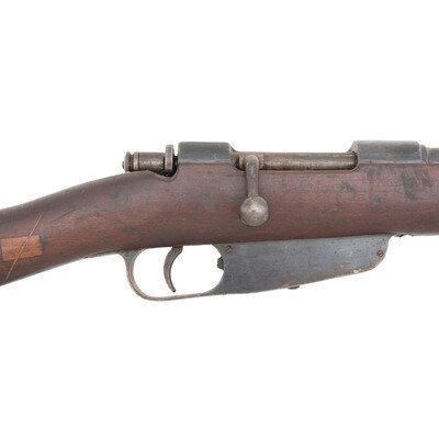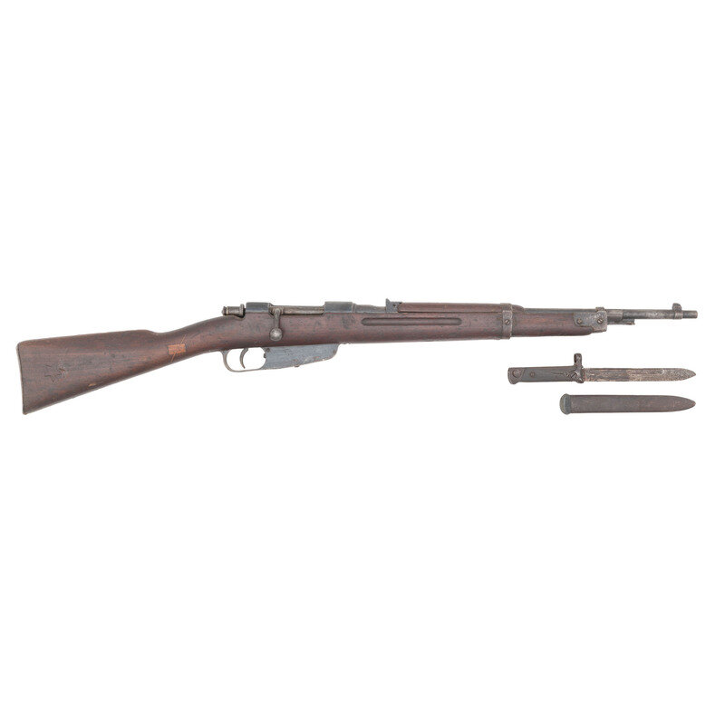 6.5x52mm. 21" barrel length. SN: A08336. Gray patina overall mounting straight wrist walnut stock with half length upper handguard, bayonet lug on forend cap, and featuring rear notch with front blade sight. Bolt action repeating rifle fed by internal magazine charged by en-bloc clips. Receiver marked {Crown}/RE/TERNI with 1940 XVIII on right. Stock shows repair on right wrist and star carved into right of stock. Left stock shows illegible symbol followed by B O/ 8338. Item includes bayonet and scabbard. {C&R}