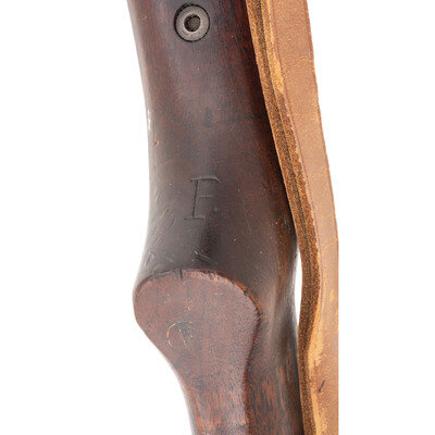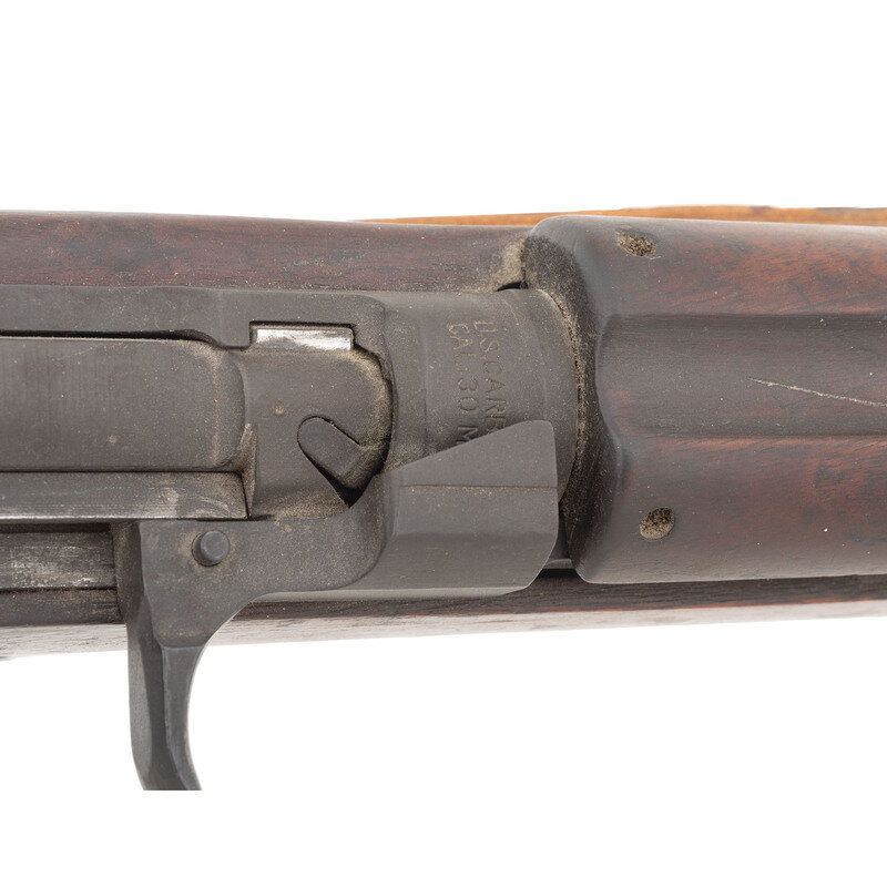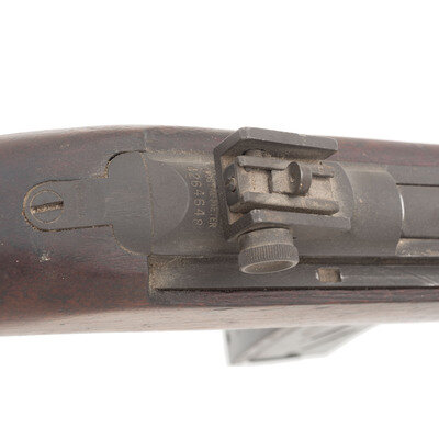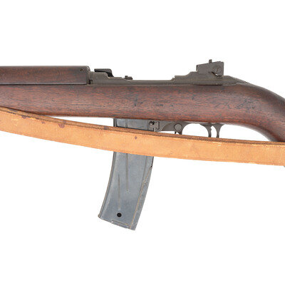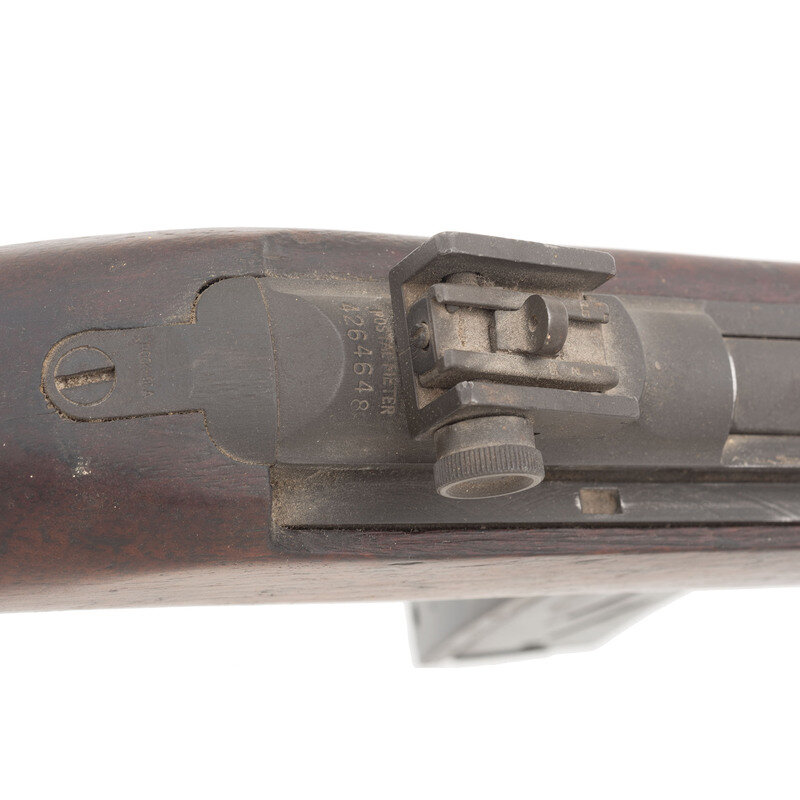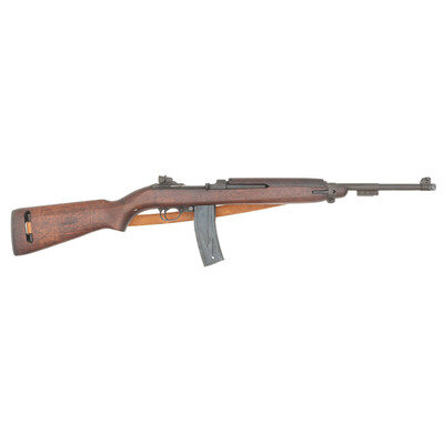 .30 Carbine. 18" barrel length. SN: 4264648. Parkerized metal finish overall mounting low-wood walnut semi-pistol grip stock and upper handguard, and fitted with late pattern adjustable rear aperture and front blade sights with protectors, and bayonet lug barrel band. Short-stroke piston driven rotating bolt semi-automatic rifle fed by detachable double stack magazines. Maker mark to rear receiver reads NATIONAL/POSTAL METER with standard model and caliber marks to forward receiver. Barrel maker mark reads BUFFALO ARMS/12-19-43/{Ordnance Bomb}. Stock lug with ROCK-OLA marking with the wood showing a P to forward wrist, circle P to lower semi pistol grip, and overlapping GHD cartouches for Guy H. Drewry. Two-rivet upper handguard marked P-U. Item features a dished bolt and rotary safety. Comes with oiler, 30-round Inland A.I. marked magazine, and a broken leather sling. {C&R}