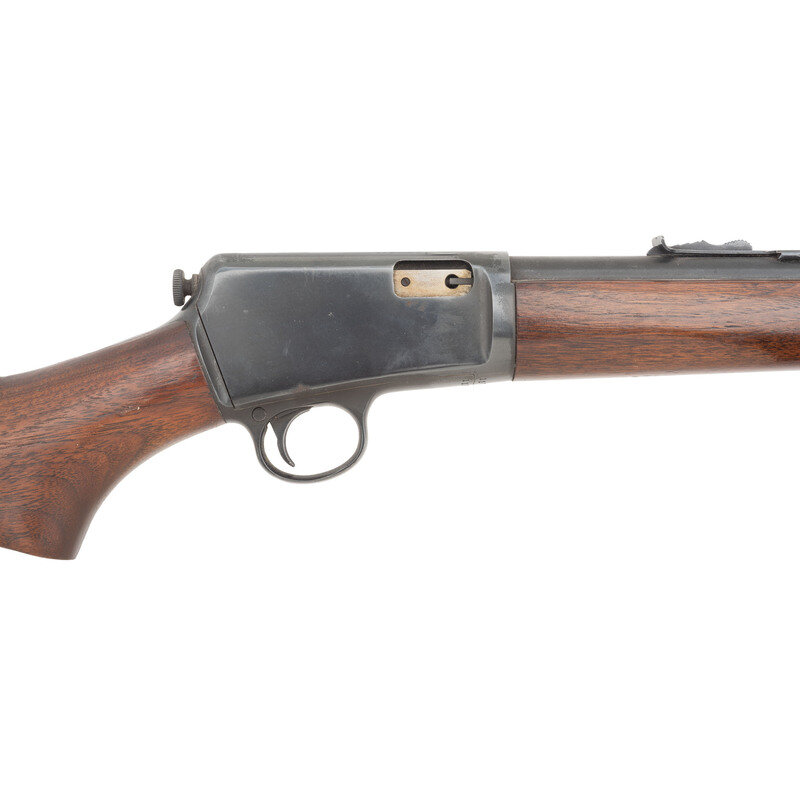 .22lr. 23" barrel length. SN: 117041. Blued metal finish with polished bolt mounting semi pistol grip walnut stock and half length handguard. Simple blowback operated repeating rifle charged by magazine in rifle butt and moutning front bead sight with rear notch. Standard make and model markings on barrel including .22 LONG R.-SUPER SPEED & SUPER-X. {C&R}