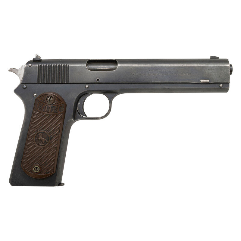 .38 Automatic. 6" barrel length. SN: 37284. (Mfg. ca 1915) Blued metal finish with polished hammer and ejector, nitre blued small parts, and mounting checkered hardrubber grips with COLT logos and {Rampant Colt} marks. Short-recoil operated single action autoloading pistol fed by detachable single stack magazines. Item features the spur hammer and rear mounting cocking serrations typical of later production Model 1902 pistols. Left slide shows patent marking reading PATENTED/APR. 20. 1897. SEPT. 9. 1902 followed by COLT'S PT. F.A. MFG. CO./HARTFORD, CT. U.S.A. Right slide is further marked AUTOMATIC COLT/CALIBRE 38 RIMLESS SMOKELESS. Left barrel shows the Colt VP monogram proof marking, P mark below trigger, and number 7 to right frame below muzzle. Right slide is drilled and tapped below ejection port on right side. Replaced rear sight. Magazine is blued and otherwise unmarked.{C&R}
