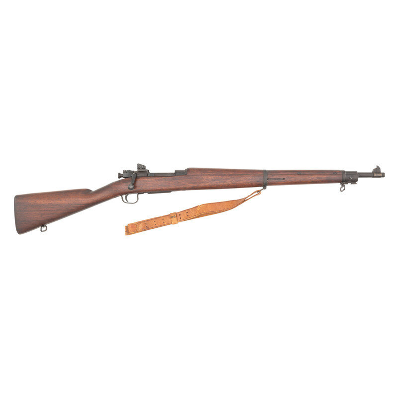 .30-06. 24.2" barrel length. SN: 3705453. Parkerized metal finish fitted in walnut straight stock with full length upper handguard mounting rear adjustable tangent sight with front blade. Bolt action internal magazine fed repeating rifle charged by stripper clips mounting leather 1905 pattern sling. Receiver marked U.S./SMITH-CORONA/MODEL 03-A3 followed by serial number. Wrist is unmarked. {C&R}