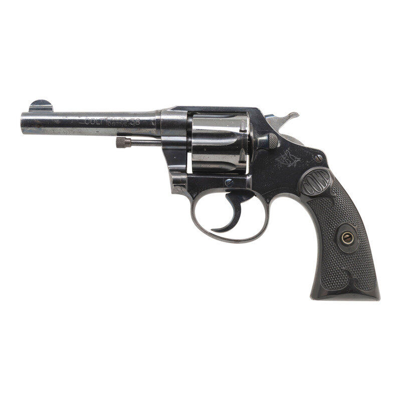 .38 Colt. 4" barrel length. SN: 61548. Blued metal finish with refinished barrel and polished hammer flanks mounting checkered COLT logo hardrubber grips. Double action six shot hand ejector revolver with topstrap rear notch and half-moon front blade sights. Markings include {Rampant Colt} logo to left sideplate, weakened two-line address on upper barrel, and weakened COLT POLICE/POSITIVE .38 to the left barrel. {C&R}