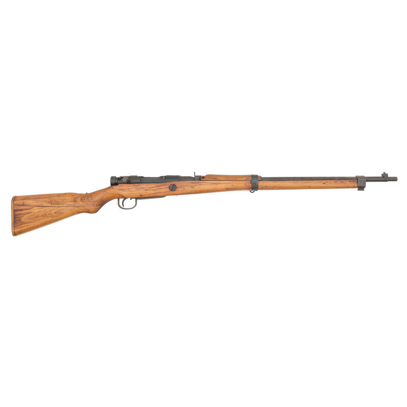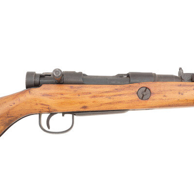 7.7x58mm. 25.9" barrel length. SN: 54430. Browned metal finish with wood semi-pistol grip stock mounting spliced toe, wood buttplate, and Last Ditch features. Bolt action internal magazine fed repeating rifle charged with stripper clips. Item features the fixed rear aperture and front Barleycorn Last Ditch pattern iron sights, with all metal parts displaying a rough finish. Item further shows a cylindrical bolt knob and non knurled cocking piece. Left receiver with Nagoya Arsenal stamp with the Imperial Japanese Chrysanthemum ground off. Stock has been sanded. {C&R}