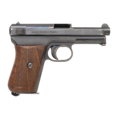 .32 ACP. 3.5" barrel length. SN: 439619. Blued finish with nitre blued small parts and nickel finished magazine mounting one piece checkered walnut grips. Simple blowback operated striker action autoloading pistol fed by detachable single stack magazines. Left slide legend reads WAFFENFABRIK MAUSER A.-G. OBERNDORF A.N./MAUSER'S PATENT with a further Mauser banner to left frame. Right slide struck with caliber mark reading MAUSER-7,65. Serial numbers match on slide, rear frame, and on magazine, with the latter additionally marked II, indicating it was the spare. Magazine floorplate shows a further Mauser banner mark. Barrel lug shows an overstamped serial number mark, indicating error at the factory or force matching, with a {Crown/U} commercial proof to right lug. Forward gripstrap struck L.G., indicating possible use by the Landjaegerei Gendarmerie, the Rural Police. {C&R}