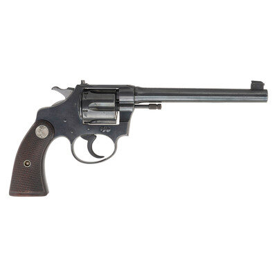 .22 LR. 6" barrel length. SN: 30027. (Mfg. ca 1925) Double action revolver with adjustable notch and blade target sights. Blued metal finish and checkered walnut grips with Colt medallions to both sides. Features a fluted 6-shot swing out cylinder drift adjustable rear with pinned front blade sights. Standard make and model marks include POLICE/POSITIVE to left barrel and two-line address and patent mark to upper barrel. {C&R}