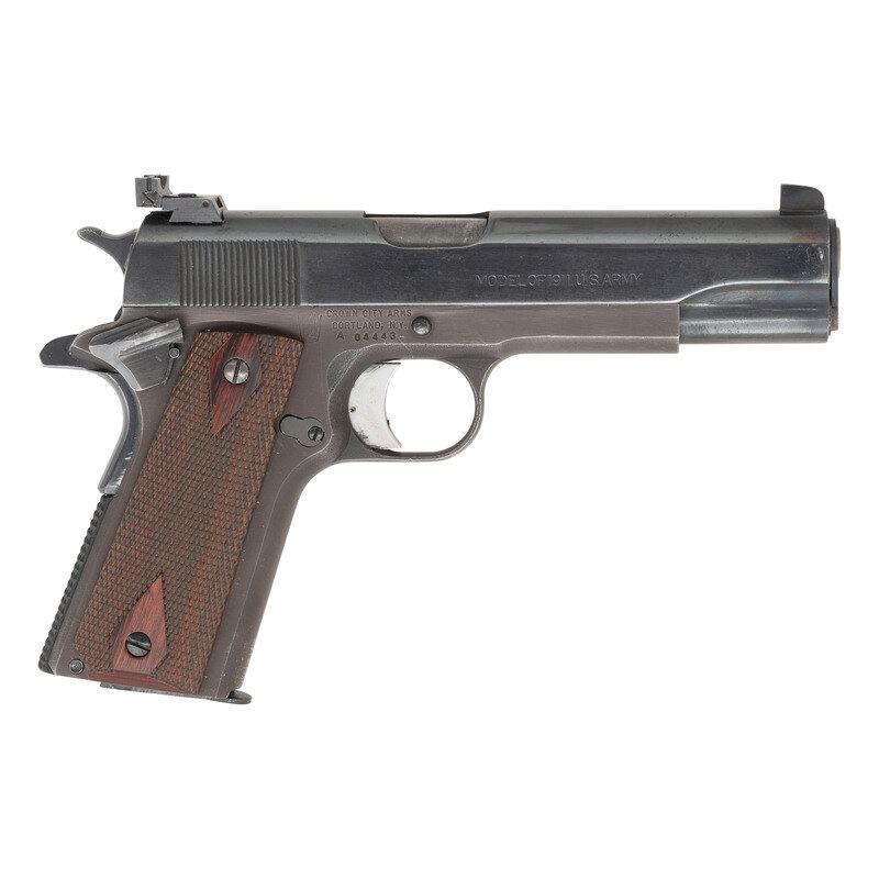 .45 ACP. 5" barrel length. SN: A04443. Blued and Parkerized metal finish with polished barrel mounting diamond checkered wood grips and adjustable target Micro rear and front blade sights. Short recoil operated single action autoloading pistol fed by detachable single stack magazines. Right frame maker marking reads CROWN CITY ARMS/CORTLAND, N.Y. with model mark to right slide of MODEL OF 1911. U.S. ARMY. Left slide marked with two-line patent and address legend with {Rampant Colt} logo between the address and patent. Item mounts an ambidexterous safety lever, checkered and rubberized Pachmayr mainspring housing, and adjustable trigger. Comes with full blued magazine marked on the floorplate 19200-/ASSY 5508694/MFR. 1M291. {MODERN}