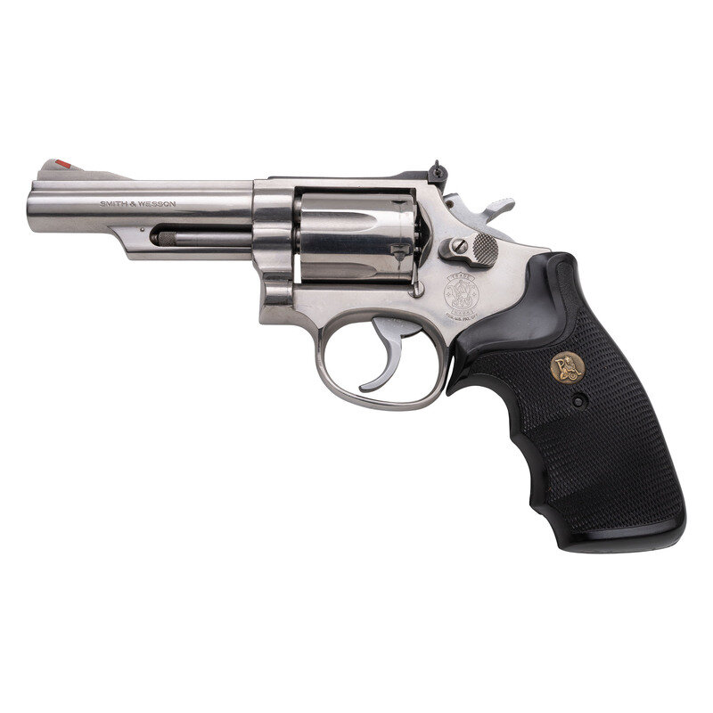 .357 Magnum. 4" barrel. SN: ACS7310. Brushed stainless steel finish with matte hammer and trigger mounting two-piece checkered black rubber Pachmayr grips. Double action six-shot hand ejector revolver Commemorating the 35th Anniversary of the Kentucky State Police. Item mounts adjustable white outline rear notch and Baughman Quick-Draw front ramp sight with red plastic insert. Interior frame displays standard MOD. 66-2 marking, with typical make and model marks overall. Right barrel is additionally marked KENTUCKY STATE POLICE/35th ANNIVERSARY 1948 to 1983, with the Kentucky State Police logo to right sideplate. {MODERN}