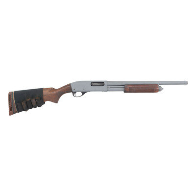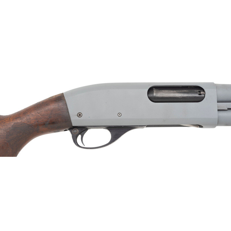 12 Gauge. 18.5" barrel. SN: 1227528V. 2.75" chamber length. Cylinder bore. Gray aftermarket paint finish with blued bolt mounting walnut semi-pistol grip stock, rubber Remington recoil pad, and serrated wood forend. Slide action repeating shotgun with half length magazine mounting single front bead sights. Standard make and model markings include CYL. bore marking to left barrel. Butt shows some adhesive residues, possibly from camouflage tape. A reproduction Texas Rangers badge ahs been installed in the right butt, and a nylon five shot shell holder applied to stock. {MODERN}