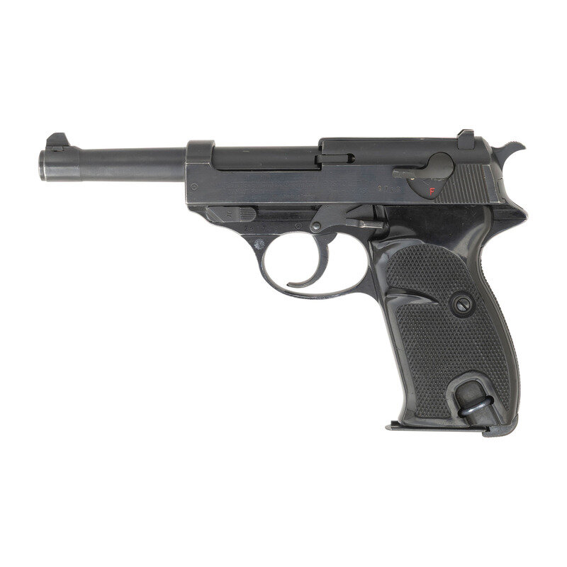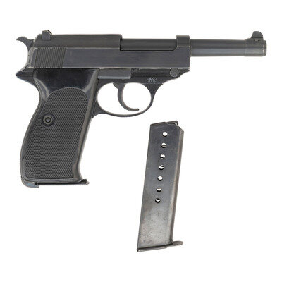 9mm Para. 4.9" barrel length. SN: 221768. Blued and black anodized metal finish with checkered black synthetic two-piece grips mounting dovetail mounted front blade and rear notch sights. Short-recoil operated DA/SA autoloading pistol fed by detachable single stack magazines. The left slide shows a circle dot mark followed by MANUFACTURE DE MACHINES MANURHIN PISTOLET P1/DE HAUT-RHIN followed by Made in France. The left frame is likewise circle dot marked and shows a sunburst over the triggerguard. Right slide struck with a French proof mark followed by the {Crossed Cannons} marking. Walther P1 pistols intended to be used by the West Berlin Police were shipped to France for completion and proofing in order to comply with injunctions against German-supplied arms in the city. Item comes with one French blued magazine and one WWII P.38 marked magazine. {C&R}