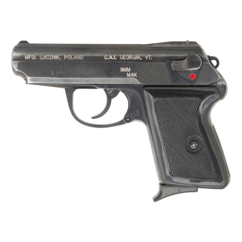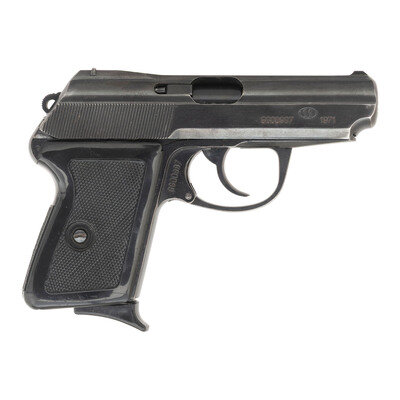 9x18mm. 3.3" barrel length. SN: GG00997. Blued metal finish with plum blued small parts mounting checkered black synthetic two-piece grips. Simple blowback operated DA/SA autoloading pistol fed by detachable single stack magazines and mounting fixed sight on a matted rib. Markings include Circle 11 maker mark to right slide followed by 1971 date. Importer applied markings to left slide for Century Arms in addition to the "P-64" model marking. {C&R}