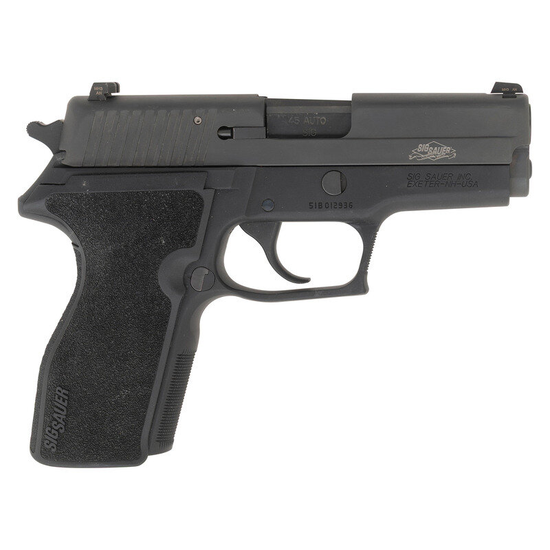 .45 ACP. 3.9" barrel length. SN: 51B012936. Nitron finish to slide with Matte anodized to alloy frame and one-piece black synthetic grips. Short-recoil operated DA/SA autoloading pistol fed by detachable double-stack magazines. Mounts triple dot Tritium night sights. Standard markings include SIG SAUER P227 SAS to left slide with SIG SAUER/CUSTOM SHOP marking engraved on the right. Lacks magazine. {MODERN}