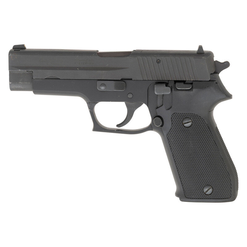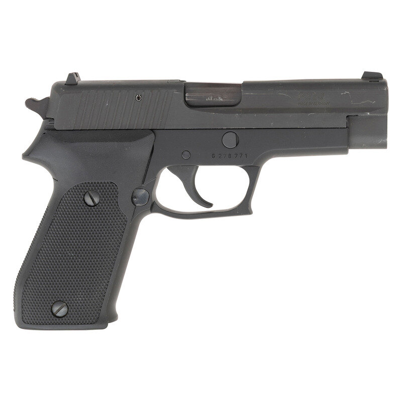 .45 ACP. 4.4" barrel length. SN: G278771. Parkerized finish to slide with black anodized frame mounting two-piece checked black synthetic grips. Short recoil operated DA/SA autoloading pistol fed by detachable single stack magazines. Standard make and model markings include P220/MADE IN GERMANY to the right slide with left marked SIG SAUER SIGARMS INC./EXETER-NH. Lacks magazine. {MODERN}