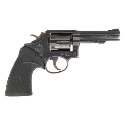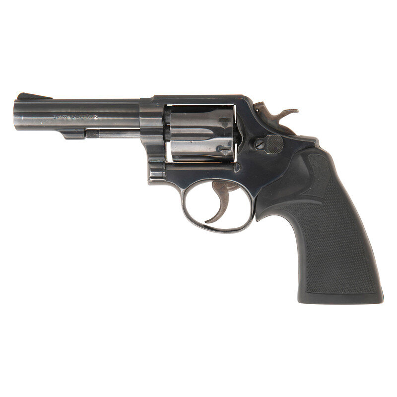 .38 Special. 4" barrel length. SN: D881769. Blued metal finish with casehardened frame and trigger mounting black rubber Pachmayr grips. Double action six-shot hand ejector revolver with pinned bull barrel on a three screw frame. Sights consist of a low-profile matted front ramp and topstrap on a matted barrel rib. Standard markings include MOD. 10-6 to the interior frame, monogram trade mark on the sideplate, and four-line address to the frame. Action has been converted to Double Action Only but retains hammer spur. {MODERN}