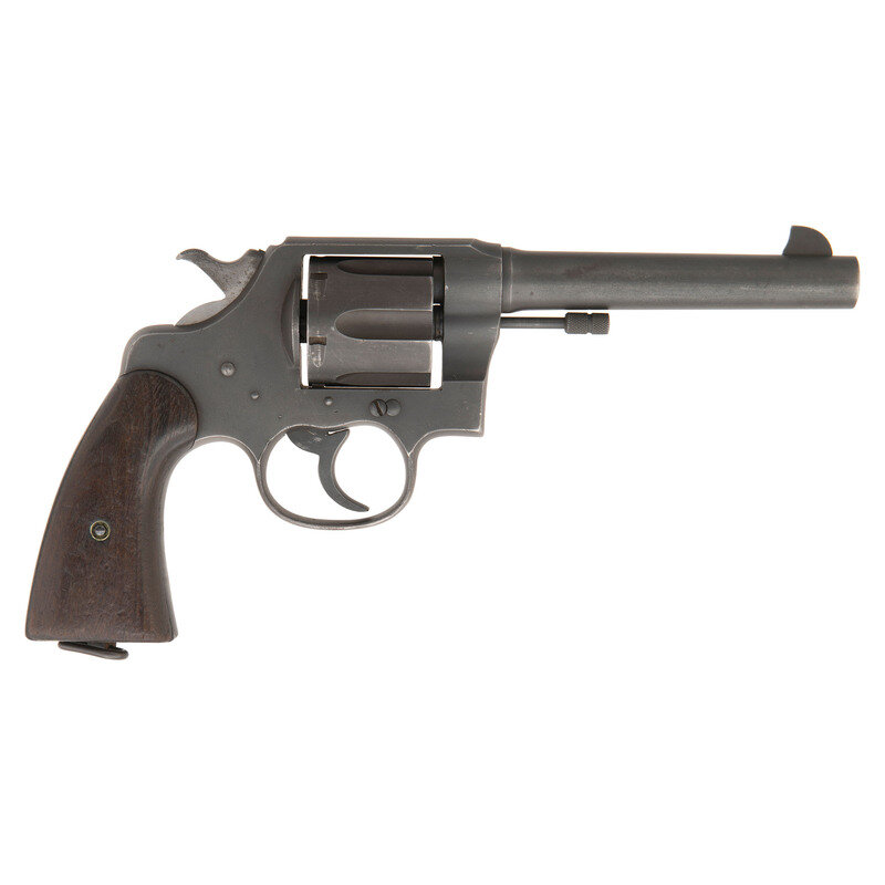 .45 ACP. 5.5" barrel length. SN: 304921. Parkerized metal arsenal refinish with smooth walnut grips, polished hammer flanks, blued trigger, and lanyard loop to butt. Double action six-shot hand ejector revolver mounting topstrap rear notch and front blade sights. Top of the barrel struck with two-line address and patent mark. Standard COLT D.A 45 to left barrel, and "UNITED STATES PROPERTY" marking below barrel. Butt marked U.S./ARMY/MODEL/1917/NO/154/740. Matching numbers on frame and crane. Government markings include double stamped A to left frame, {Eaglehead/S20} forward of hammer on left frame, with H and F stamps to interior. Grips have been sanded, and lack visible cartouches. Front sight, address, and caliber roll mark are offset slightly to the left. Inspector mark is in line with ejector rod, meaning it left the factory with the barrel canted and passed inspection. {C&R}