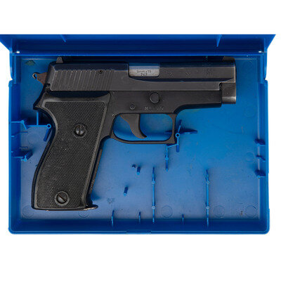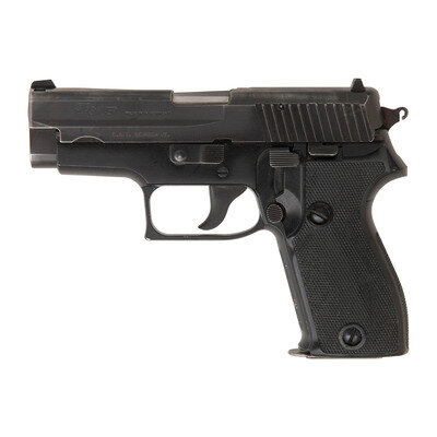 9mm Para. 3.6" barrel length. SN: M445747. Parkerized metal finish with black anodized frame mounting checkered black synthetic two-piece grips. Short-recoil operated DA/SA autoloading pistol fed by detachable single-stack magazines. Left slide marked SIG SAUER MADE IN W. GERMANY with importer marking of C.A.I. GEORGIA VT. Right slide struck P6 followed by NW with a date mark of 5/80/747. Barrel marking reads 9mmx19/747. Comes with a single P6 marked magazine in a blue SIG SAUER branded hard case. {MODERN}