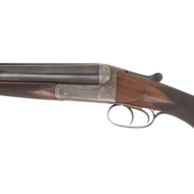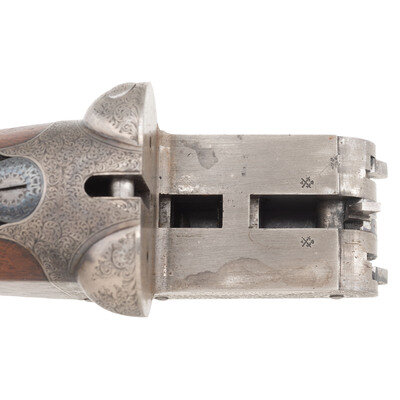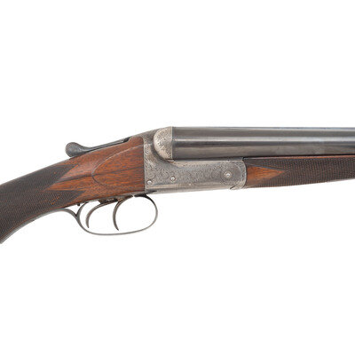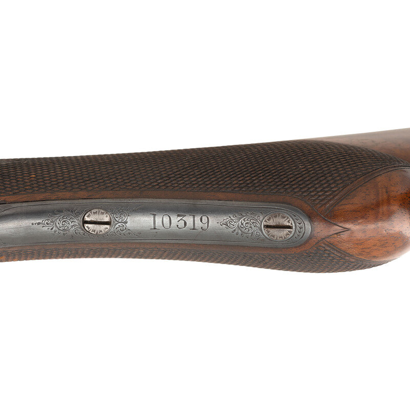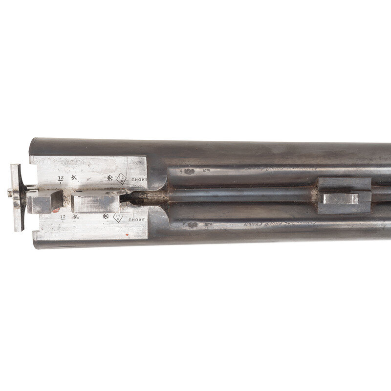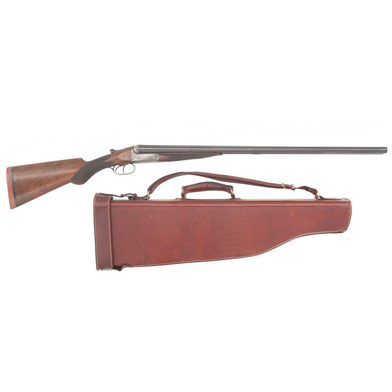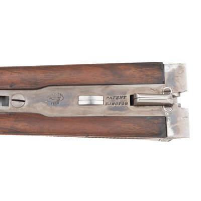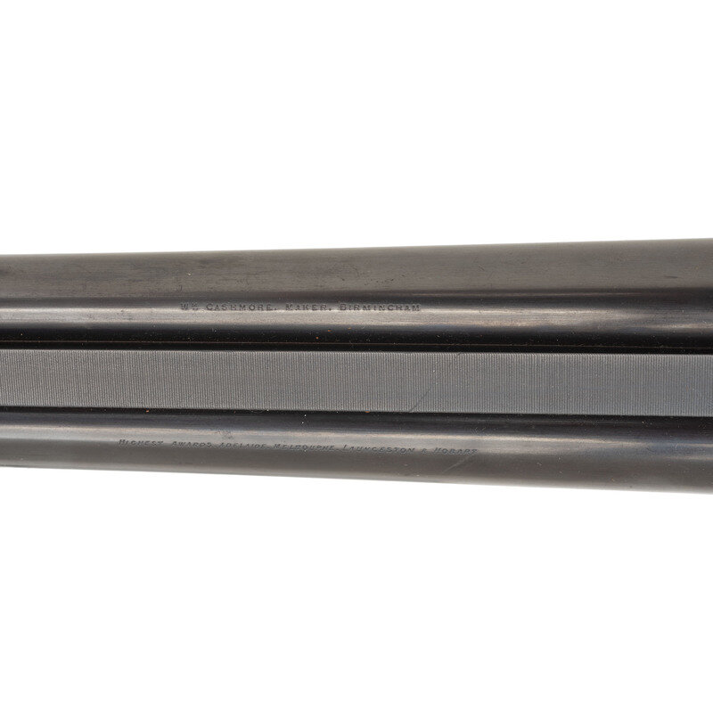 12 Gauge. 30" barrel length. SN: 10319. 2.75" chamber length. Improved Modified Left. Overbore Right. Casehardened finish with blued barrels and small parts mounting round knob semi-pistol grip stock and splinter forend featuring bordered multipoint checkering. Double barrel side by side boxlock ejector shotgun with double triggers and twin bead sights. Frame displays traditional English style scroll engraving enclosing WM. CASHMORE maker markings to both sides. Birmingham proof markings to barrel flats and watertables. Right barrel struck WM. CASHMORE. MAKER. BIRMINGHAM with the left marked HIGHEST AWARDS. ADELAIDE MELBOURNE. LAUNCESTON & HOBART. Steelmaker mark to both barrels below handguard reads FLUSSSTAHL KRUPP ESSEN. The interior of the forend is struck PATENT/EJECTOR with a further REG/TRADE MARK stamp. Forend engraving matches the shotgun, and mounts a horn tip. No serial number to forend. Triggerguard and barrels most likely refinished. Rear sight bead has broken off leaving socket behind with the front still intact. Silver escutcheon to comb is unsigned and mounted 1" from recoil pad. Comes with an unmarked leather leg of mutton case. 14" length of pull. 1.5" drop to comb. 2.75" drop to heel. {C&R}