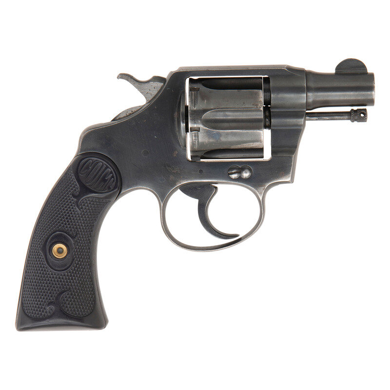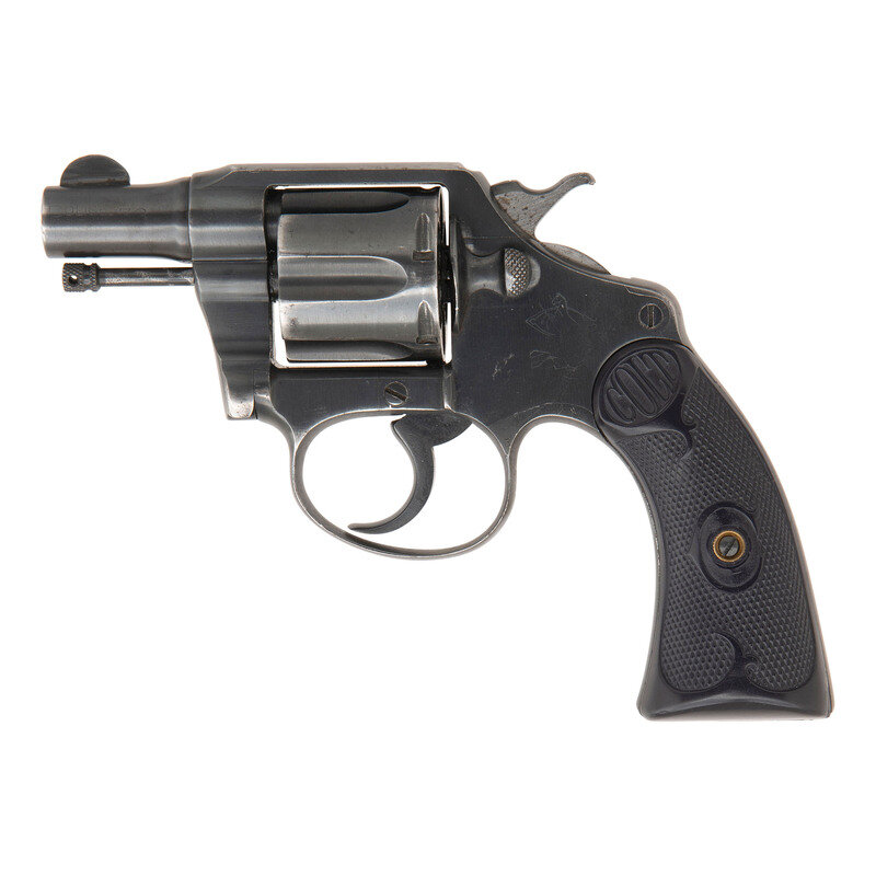 .38 Colt. 1.875" barrel length. SN: 29510. (Mfg. ca 1909). Blued metal finish with polished hammer flanks mounting checkered COLT logo hardrubber grips. Double action six-shot hand ejector revolver with topstrap rear notch and custom fitted half-moon front blade sights. Left barrek shows a partial POLICE/POSITIVE .38 marking, indicating the barrel has been shortened. No visible address to right or upper barrel. Left sideplate struck with {Rampant Colt} logo within C. Butt struck with the inventory number 3242. {C&R}
