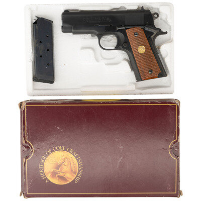 .45 ACP. 3.5" barrel length. SN: FA38623. Blued metal finish with polished flanks and matte rounds mounting checkered walnut Colt medallion grips. Short-recoil operated single action autoloading pistol mounting triple dot sights with red dot front and white dots to rear. Standard markings include COLT MK IV/SERIES 80 {Rampant Colt} to the left slide and OFFICER'S ACP to the right. Item features a coned barrel with bushing. Comes in a Colt logo marked cardboard box with owner's manual and a total of two magazines. {MODERN}