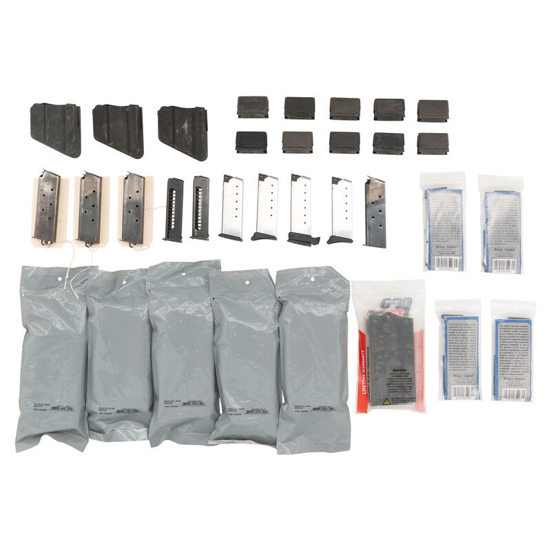 Large group of magazines including (5) Pro Mag PMAG AR platform magazines in factory bags, (4) Wilson Combat 1911 magazines in factory bags, (3) Two-Tone 1911 magazines with lanyard loops, (1) Two-Tone M1911 magazine without a lanyard loop, (3) SMLE magazines and (4) other pistol magazines, another rifle magazine and (10) M1 Garand En Bloc Clips.