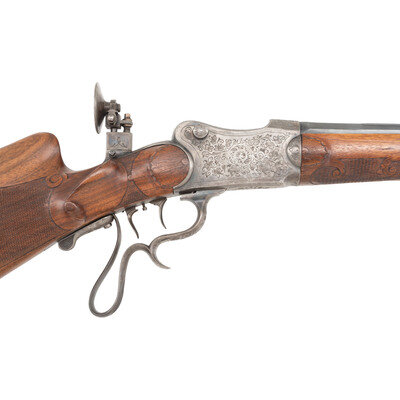 8.15x46R. 30" fluted octagon to round barrel. SN: 108. Blued and color casehardened finish, European hardwood stock with Swiss style butt, raised carved decorations, raised cheek rest and checkered dog's head motif forend. Single shot Martini action target rifle with tang mounted peep rear sight, ramped blade front sight, double set triggers and skeletonized pistol grip operating lever. Barrel marked Gotthilf v. Nordheimr, Mehlis. Gottlieb v Nordhiem worked in Zella-Mahils circa 1916-1939. Receiver engraved tin simple, flowing foliate themes with raised carved oak leaves and acorns on the butt. Includes a steel cleaning and clearing rod.