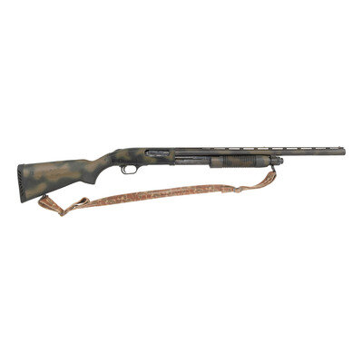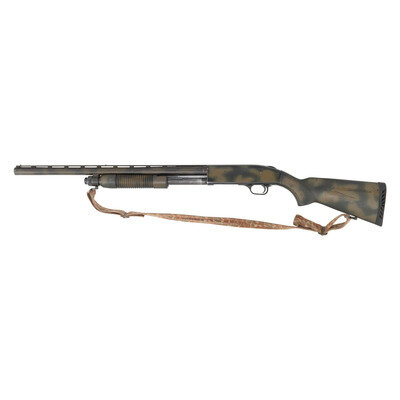 12 Gauge. 24" barrel length. SN: UM08874. 2.75" chamber length. Interchangeable Chokes, currently mounts Modified Choke to overbored barrel. Blued metal finish with black anodized frame hand painted with OD green spray painted camouflage mounting black synthetic semi pistol grip stock with rubber recoil pad. Slide action repeating shotgun mounting a vented barrel rib with twin bead sights, and with the receiver drilled and tapped for optics mounting. Standard make and model markings including the factory warning NOT FOR USE WITH SLUGS. Comes with a nylon camouflage pattern sling. {MODERN}