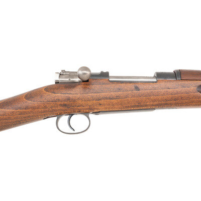 6.5x55mm. 29.1" barrel length. SN: 481445. Blued metal finish with polished bolt mounting walnut straight wrist stock with half length upper handguard, and standard adjustable ladder rear notch and front blade sights. Bolt action internal magazine fed repeating rifle charged with stripper clips. Standard markings include CARL GUSTAFS STADS/GEVARSFAKTORI/1920 marking to receiver and Swedish Crown. Comes with cleaning rod and conversion disc to right butt. {C&R}