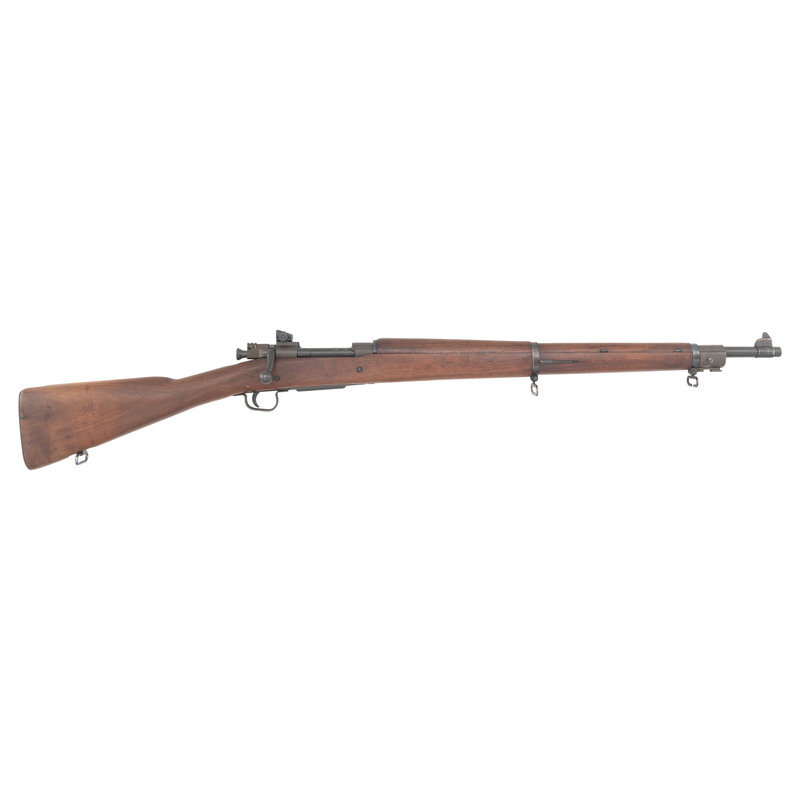 .30-06. 24" barrel length. SN: 4811185. Arsenal refinished metal mounting walnut semi pistol grip stock with adjustable rear tangent sight and front blade. Bolt action repeating rifle fed by internal magazine charged by stripper clips. Receiver marked U.S./SMITH-CORONA/MODEL 03-A3 followed by serial number. Wrist marked with {Circle P} and stock marked with several arsenal marks including {Circle 18}, {Triangle 8}, {Square 4}, and {Diamond 3}. Barrel marked S A/{Ordnance Bomb}. Stock marked with OG on left side. {C&R}