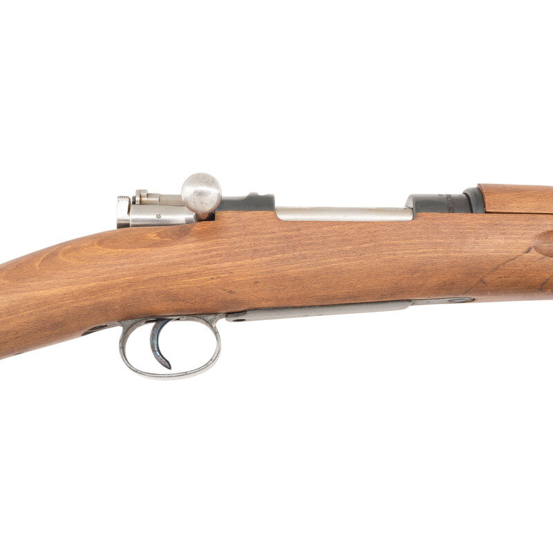 6.5x55mm. 29" barrel length. SN: 516021. Blued metal finish with polished bolt set in wood straight wrist stock with half length upper handguard. Bolt action internal magazine fed repeating rifle charged by stripper clips mounting rear adjustable aperture notch with front blade sights. Standard make and model markings with all visible serial numbers matching. Item includes cleaning rod. {C&R}