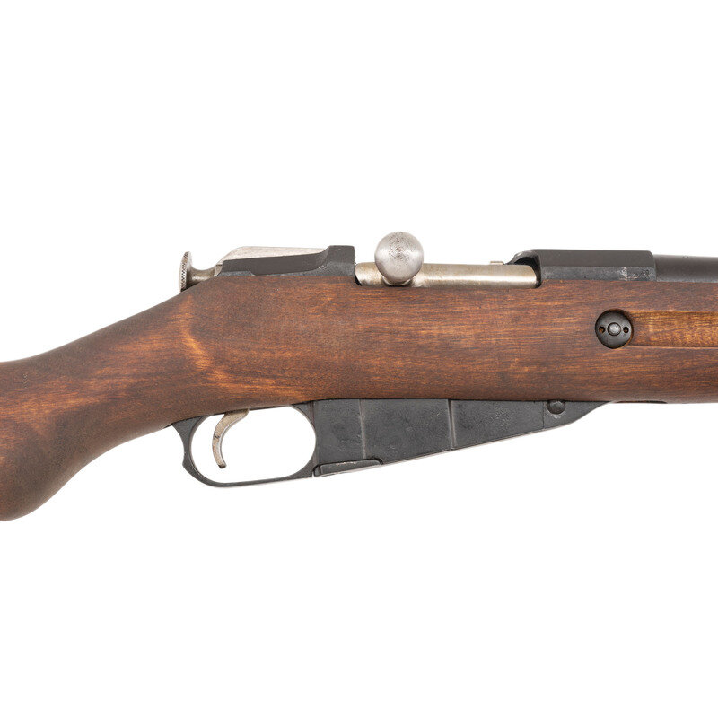7.62x54mmR. 27" barrel length. SN: D74515. Blued metal finish with polished bolt mounting birchwood semi-pistol grip stock featuring a full length upper handguard and standard spliced forward handgurd. Bolt action internal magazine fed repeating rifle charged with stripper clips. Item shows the VKT barrel maker marking below Finnish boxed SA stamp, and a date of 1944. Item mounts standard adjustable ladder rear notch and front blade sights with protectors, and standard sling loops. Importer applied serial number to left side of octagonal receiver. {C&R}