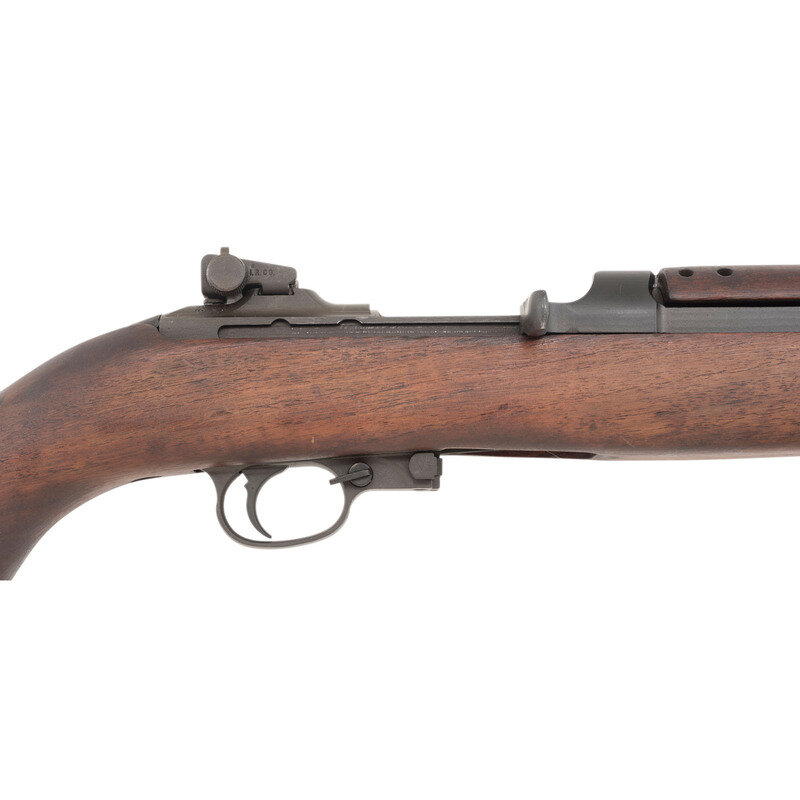 .30 Carbine. 18" barrel length. SN: 2956199. Parkerized arsenal refinish in low-wood semi-pistol grip stock with four-rivet handguard and late pattern adjustable rear notch and front blade sights with protectors, the former marked I.R. CO.. Short stroke piston driven gas operated semi-automatic rifle fed by detachable double stack magazines. Receiver displays INLAND DIV. maker mark and standard model markings. Punch dot pressure proof to dished bolt and to receiver behind ejection port. Barrel date reads UNDERWOOD/8-43/{Ordnance Bomb} followed by a further P proof marking. Left butt stamped with {Star/FAT/77} mark indicating Italian refurbishment. Circle P to base of semi-pistol grip. Comes in CMP box with receipt and owner's manual. Lacks magazine and Certificate of Authenticity. {C&R}
