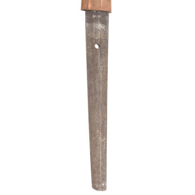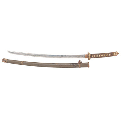 26.25" nagasa (blade length). 39.5" overall with tsuka (hilt) and saya (scabbard). Shinogi-zukuri blade with O-kissaki, Ihore mune, and a sugu (flat) hamon line. The nakago is signed with one mekuge pin hole but is missing mekuge pin. Mounts features standard spring catch. Tsuba is of the pierced pattern with four sakura (cherry blossoms) on each face. Standard brown grip tape over white rayskin wrap with two sakura pattern menuki.