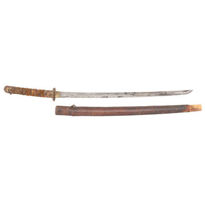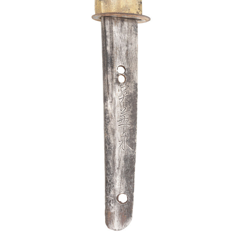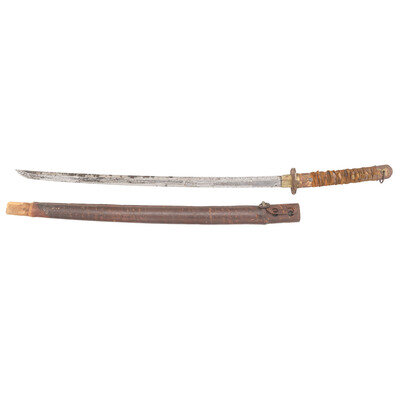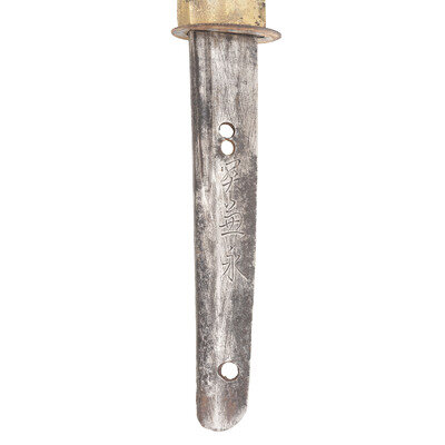 26.25" nagasa (blade length). 38.5" overall with tsuka (hilt) and saya (scabbard). Shinogi zukuri style blade with cut down Chu-kissaki and Ihori mune set in Reproduction Type 98 Shin Gunto mounts with leather wrapped wood saya mounting a single ring mount. Blade displays Sugu (straight) hamon line obscured by machine buffing and repolishing. Tsuba is cast likely reproduction with four Sakura (cherry blossoms) to corners, and replaced Fuchi and authentic Kashira. Tsuka is cut down for Same, but lacks any rayskin, and shows loosely retied and broken grip tape. Both sides of the Futsu Nakago are signed, but the fuller extends into the Nakago, and Mekugi pin holes are relocated, suggesting the Nakago was cut down at some point, and polished with the rest of the blade.