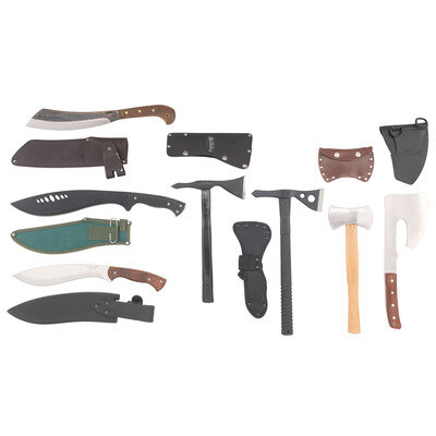 1) Chinese Kukri style machete with 13" blackened blade, 19" in overall length and a green synthetic sheath. About Fine showing little use.