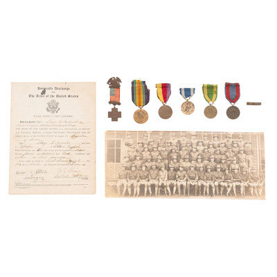 Approx. 14 medals belonging to James J. Connelly of Walton, New York (as per consignor's modern notes). Photocopied service records indicate that Connelly served with the 35th and 39th US Volunteer Infantries. Included in the group is a Spanish American War Service medal, New York Spanish American War medal, New York Mexican Border War medal, New York 10-year National Guard medal, French Verdun medal, and others. -- An Honorable Discharge document identified to George E. Hardwick for his service with the US Army from 1898-1926, housed together in a riker mount with a panoramic photograph of a group of soldiers (approx. 6 1/4 x 14 3/4 in.) (vertical crease down middle), and 6 medals. The photo and medals lack identification, but considering they were kept together with the document by the consignor, it is possible that they belonged to Hardwick. Medals include a Philippine Insurrection medal, World War I service medal presented by New York state, Spanish American War service medals (one presented by New York state), and others. -- 10 medals, including Order of the Serpent medal, Spanish American War service medal, World War I Victory medal, Mexican Border War service medals, and masonic medals. -- 5 USS Olympia pinbacks. -- 5 examples of insignia tentatively identified as representing the Spanish Blue Division from the World War II period.