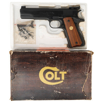 .45 ACP. 5" barrel length. SN: FG34475. Blued finish with matte rounds and polished flanks featuring matte finished adjustable trigger, adjustable target BO-MAR sights, and checkered Colt medallion Cocobolo grips. Single action short-recoil operated autoloading pistol fed by detachable single stack magazines. Trigger and hammer have been replaced, with the hammer having a longer spur in order to clear the rear sight. Left slide struck COLT MK IV/SERIES 80 followed by the {Rampant Colt} logo with the right marked GOVERNMENT MODEL. Right frame further marked COLT'S PT. F.A. MFG. Co. HARTFORD, CONN. U.S.A. Item comes in its original Colt marked cardboard box with the owner's manual, and the original hammer and trigger. {MODERN}