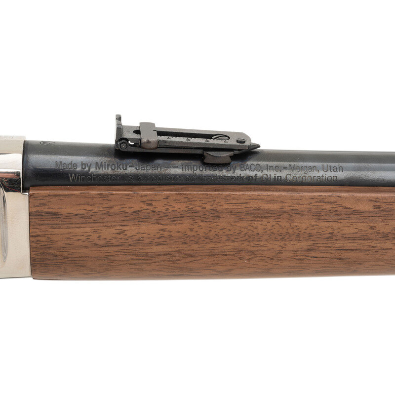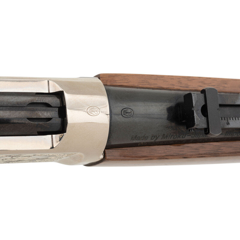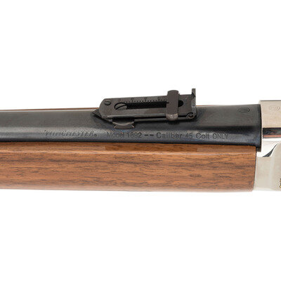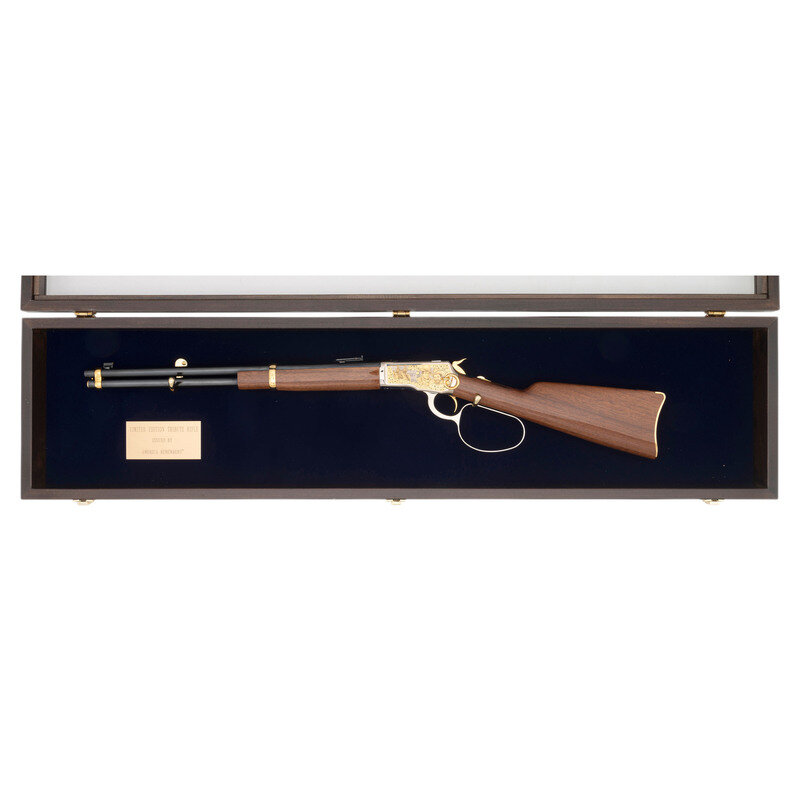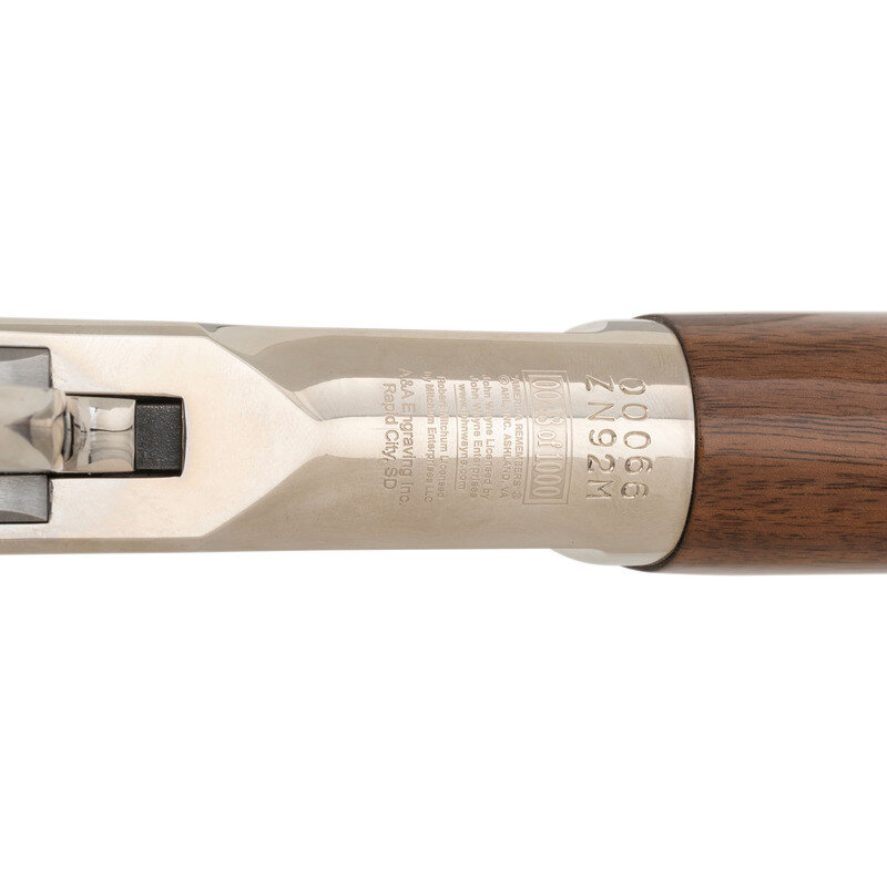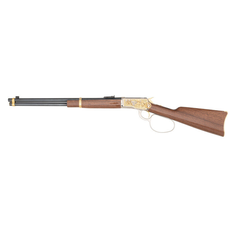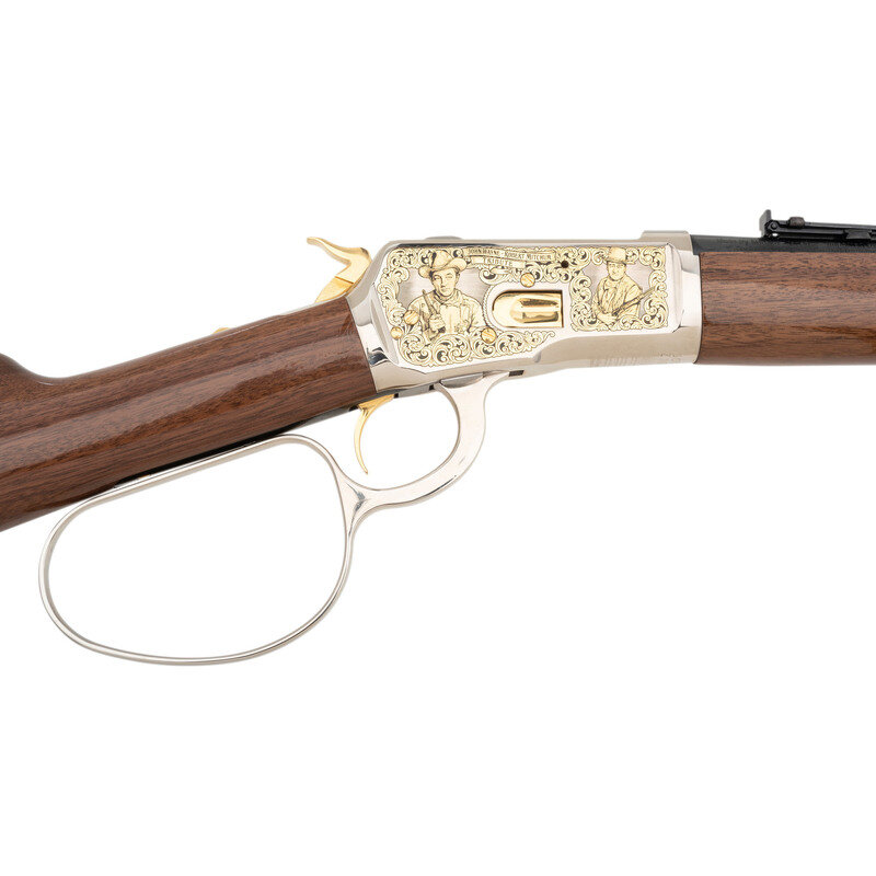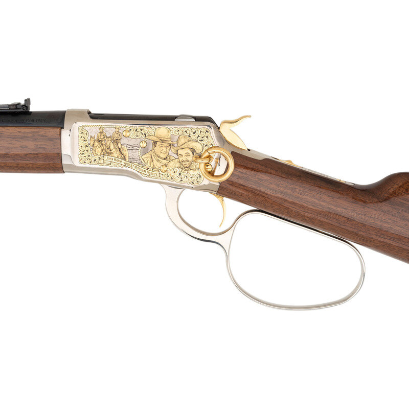 .45 Colt. 20" barrel. SN: 00066ZN92M. Blued barrel, gold and silver plated receiver, gold plated furniture, smooth hardwood stock and forend. Lever action tubular magazine fed repeating saddle ring carbine with ladder rear sight, dovtailed front sight, saddle ring on reverse and large loop lever. Laser engraved receiver with images of John Wayne and Robert Mitchum, performed by A&A Engraving of Rapid City, SD. Carbine is number 48 of 1,000 of these commemorative guns to be issued. Includes a glass lid wood case for display and original paperwork. {MODERN}
