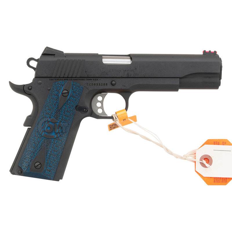.45 ACP. 5" barrel length. SN: CCS033288. Blued metal finish and stainless barrel with synthetic blue G10 checkered grip panels mounting Novak rear sight and fiber optic front sight. Single action repeating pistol charged by detachable magazine featuring upswept beavertail safety, rear slide serrations and flat main spring housing with undercut trigger guard. Pistol features dual recoil spring and National Match barrel. Slide shows GOVERNMENT MODEL COLT AUTOMATIC SERIES 70 marking on left slide with COMPETITION SERIES on right. Right side of frame marked with serial number and Colt manufacturer's address. Item includes original Colt hard case and eight round Colt magazine. {MODERN}