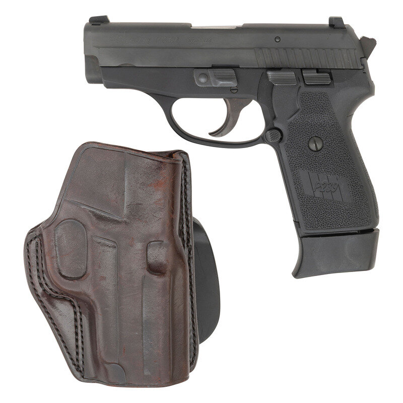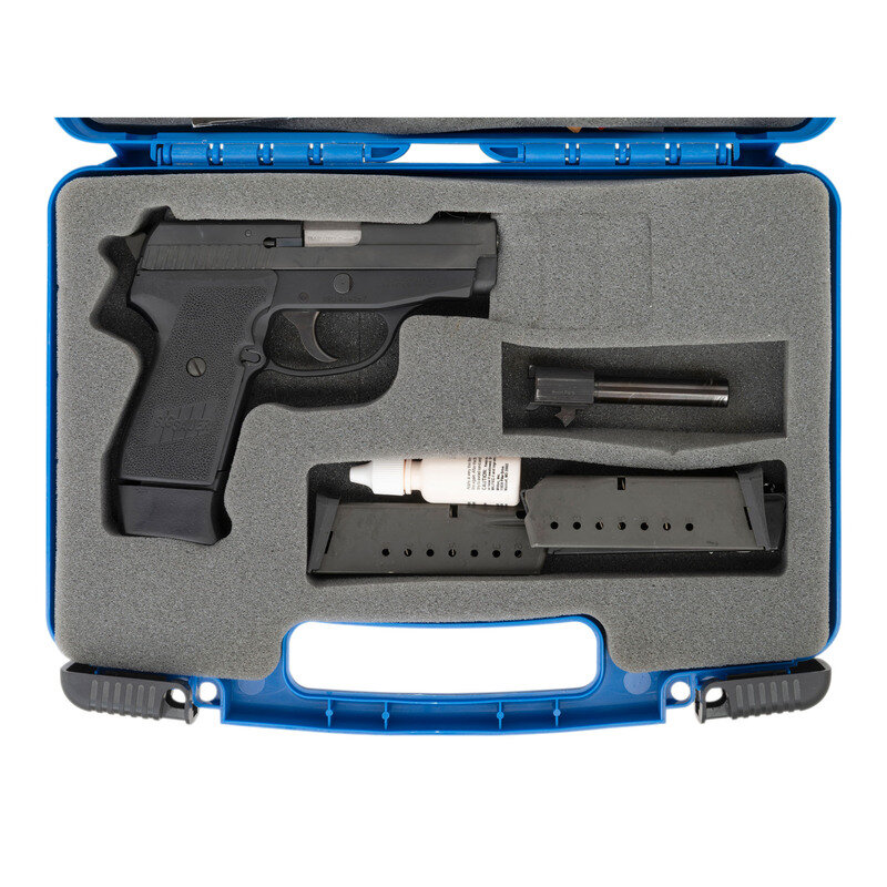 9mm Para. 3.6" barrel length. SN: SBU004267. Nitron finished slide with brushed barrel and black anodized frame mounting two-piece textured black synthetic grips with SIG SAUER logos. Short-recoil operated autoloading pistol fed by detachable single stack magazines mounting triple dot tritium night sights. Item mounts a BAR STO barrel. Comes in original blue synthetic hard case with the original Sig marked barrel. Also include are the owner's manual, and a total of four magazines including one 10-shot extended model and three 8-shot examples. Further accompanied by a leather GALCO IWB holster. {MODERN}