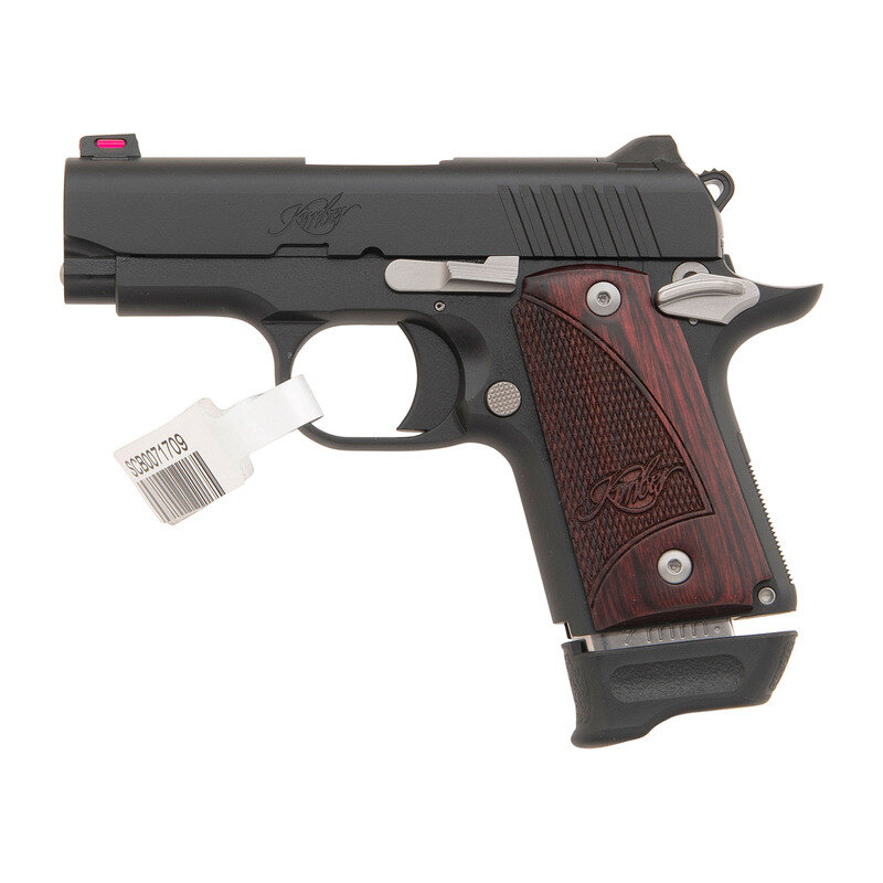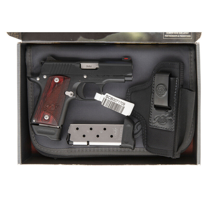 9mm Para. 3.15" barrel length. SN: SCB0071709. Black Oxide finished slide and frame with brushed stainless barrel mounting Kimber logo marked and checkered red laminated wood grips. Single action short-recoil operated autoloading pistol fed by detachable single-stack magazines. Item mounts triple dot sights with white dots to rear sight and red fiber optic front sight. Standard marks including Kimber logo to left slide and MICRO 9 to right. Comes with its original cardboard box containing: owner's manual, one spare magazine, and a Kimber logo marked DESANTIS GUNHIDE IWB holster. {MODERN}