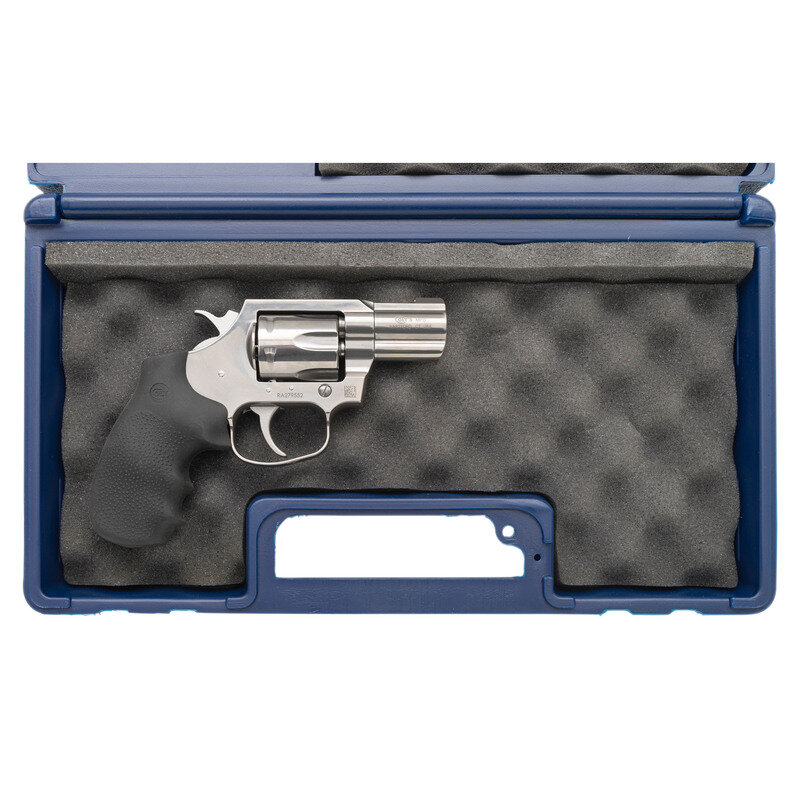 .357 Mag. 2" barrel length. SN: RA279552. Polished stainless steel finish mounting rubberized Colt grip with finger grooves and sights consisting of front post mounted with gold dot and top strap rear notch. Double action six shot hand ejector revolver. Standard make and model markings. Item includes original case. {MODERN}