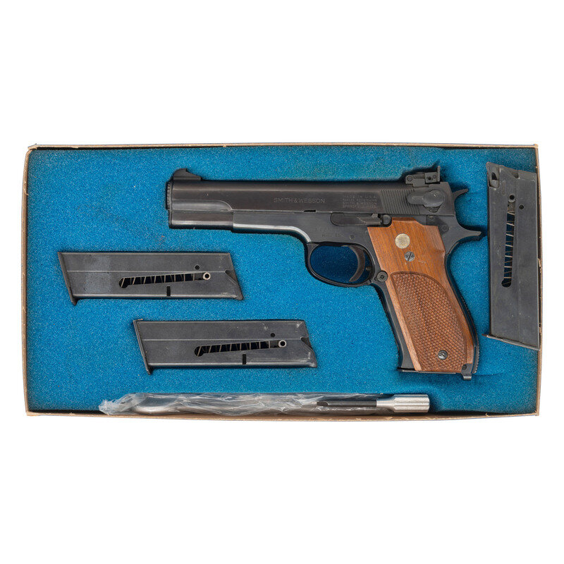 .38 Special Midrange. 5" barrel length. SN: A429893. Blued metal finish with stainless barrel and wood grip panels. Single action short recoil operated autoloading pistol charged by detachable single stack magazines mounting target sights with checkered backstrap. Wood grip panels feature bordered checkering with Smith & Wesson medallion on either side. Slide marked SMITH & WESSON MADE IN U.S.A./MARCAS REGISTRADAS/SMITH & WESSON/SPRINGFIELD MASS. on left side. Frame marked with Model 52-2 on left underneath serial number and {Smith & Wesson logo} on right. Item includes original box with accessories and three additional magazines. Item also includes set of Brownells tweezers and magnifier. {MODERN}