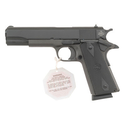 .45 ACP. 5" barrel length. SN: RIA2885288. Parkerized finish overall with rubberized checkered grips and standard sights. Single action short recoil operated autoloading pistol charged by detachable single stack magazines. Features beavertail safety and thumb safety, along with flat main spring housing. Includes original box and accessories, as well as leather carry case. {MODERN}