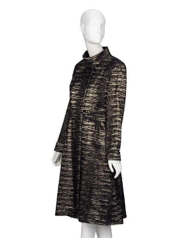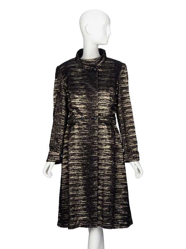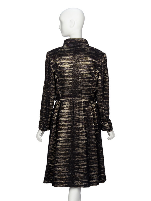Coat dress in gold lamé-shot black bouclé tweed. Stand collat. Light padding at shoulders. Full-length set-in sleeves with turned up & buttoned cuffs. Attached self-fabric belt at waist. Two pockets with flaps at waist; two slit pockets at side seams. Double breasted; two button closures at upper chest and waist. Unlined.