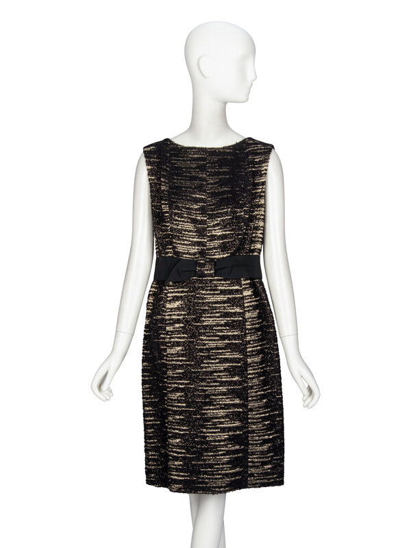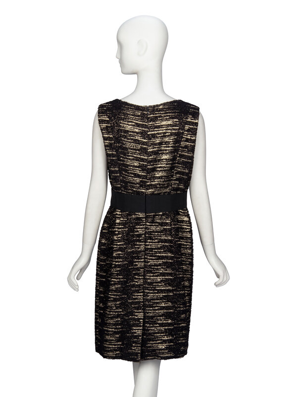 Sleeveless sheath dress in gold lamé-shot black bouclé tweed. Wide bateau neckline. Attached black petersham belt detail at waist.