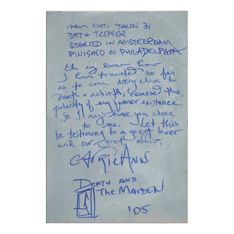 with the artist's monogram (lower left); signed Carrie Ann, dated, titled and dedicated (verso); signed Carrie Ann Baade, dated, titled and dedicated again (verso on backing board)