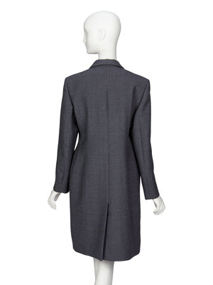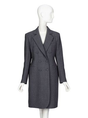 Tailored knee-length top coat in grey brushed wool twill. Notched lapels. Light padding at shoulders. Full-length set-in sleeves. Slightly fitted at waist. Two besom pockets at front (unopened); one upper chest welt pocket. Double breasted; with two fabric-covered button closures at front. Fully lined.
