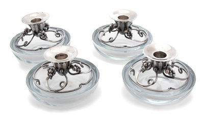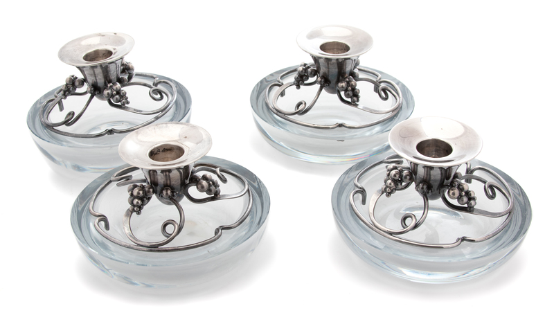 each with circular bobeche resting on grape bunch and scroll supports, circular glass dish below