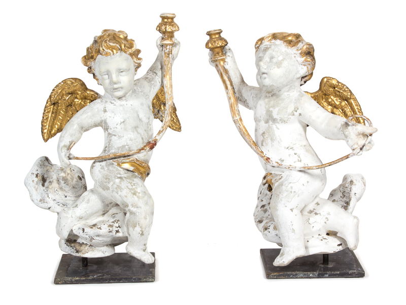A Pair of Italian Carved Painted, and Parcel Gilt Putti Single Light Candelabra Height 22 3/4 x width 13 x depth 13 inches.