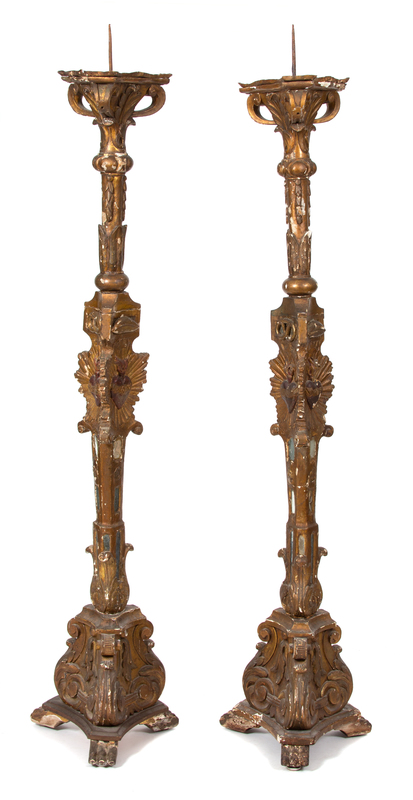 boldly carved standards with pricket fitting at top, with inset mirrored glass panels.