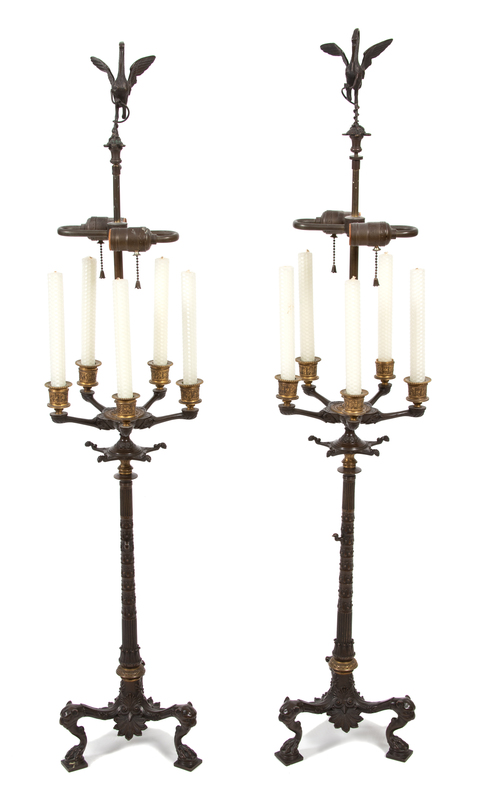 A Pair of Neoclassical Bronze and Gilt Bronze Five-Light Candelabra Height 43 x diameter 9 1/2 inches.